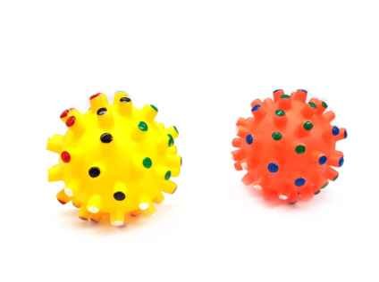 Pelota de goma con puntas y chifle. De goma blanda.